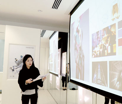 協同授業のテーマは『TOKYO-accessory』。提示された4つのキーワードからひとつを選び、“東京”と組み合わせたセットアクセサリーのデザインに挑戦しました。布や樹脂などの異素材と組み合わせた作品をスワロフスキー社で発表。スワロフスキー・クリスタルをいかに効果的に使うか、さまざまな角度からアドバイスをいただきました。
