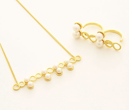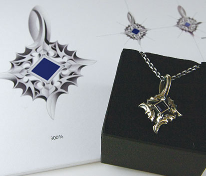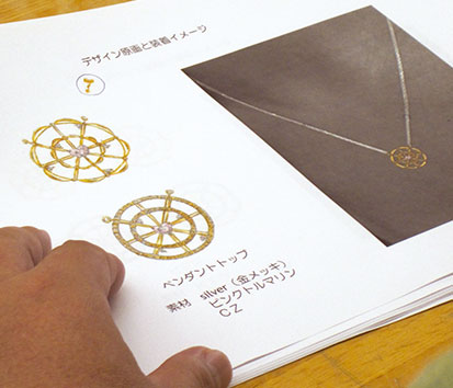 老舗シルバーアクセサリーブランド「エムズコレクション」との商品企画に挑戦。普段の作品制作とは違い、商品としての完成度、強度、装着性など、あらゆることに配慮する必要があります。デザイン画チェックには社長をはじめとする社の方にお越しいただき、学生自らデザインイメージや想いを説明。いただいたアドバイスをもとに制作された原型から優秀作品が選ばれ、見事商品化が決定しました。