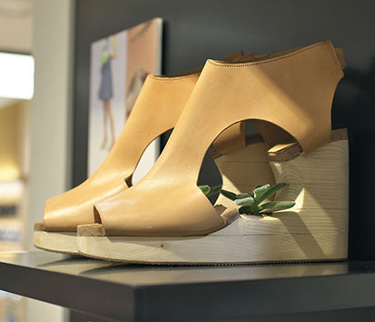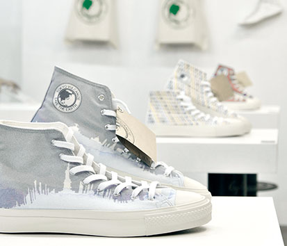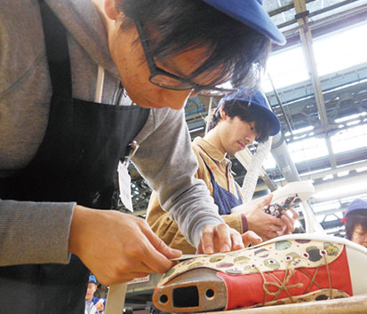 株式会社ムーンスターの協力のもと行われるスニーカー制作。テキスタイルデザインから取り組み、その生地を使ってアッパー部分(甲部)を学内で制作。それをムーンスターの久留米工場に持参し、加熱・加圧しながら靴底を接着・成型する「バルカナイズ製法」を体験しました。完成したスニーカーはブランドロゴやパッケージ、ディスプレイなどのトータルコーディネートを行い、期間限定ショップで学生自らが店頭に立ち販売。お客様の反応を直接感じることで、次のシューズ制作のヒントを見出しました。