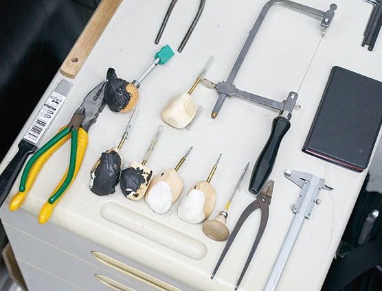 ジュエリー テクニシャン門倉 晃大さんジュエリーの修理は、制作の工程とは異なり、完成された状態のものに手を加えるのが難しいところだ。「お客様の大切なジュエリーをお預かりしているので、失敗は許されないという緊張感があります」。ただ壊れた部分を直すだけでは、また同じ箇所が壊れるリスクがある。だからジュエリーの状態から使用状況を推測し、必要な補強をするという繊細な心配りも求められる。修理の方向性が定まらず悩むこともしばしば。「解決の糸口がつかめた瞬間は、パズルのピースがはまったような快感があります。それがこの仕事の面白さかな」。