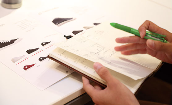 おおよそのイメージを固めてからデザイン画を描き、ディテールを詰めていく。絵だけでイメージがつかめないときは、紙やシーチングなどの素材を使って立体模型をつくることも。サンプルをつくる段階では、満足いくものが上がるまで何度もやり取りを重ねる。思い描いたとおりのサンプルが上がり、社内の女性スタッフに「いいね!」と言ってもらえたときがいちばんの喜びだと言う。