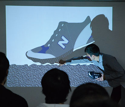 株式会社ムーンスターの協力のもと行われるスニーカー制作。テキスタイルデザインから取り組み、その生地を使ってアッパー部分(甲部)を学内で制作。それをムーンスターの久留米工場に持参し、加熱・加圧しながら靴底を接着・成型する「バルカナイズ製法」を体験しました。完成したスニーカーはブランドロゴやパッケージ、ディスプレイなどのトータルコーディネートを行い、期間限定ショップで学生自らが店頭に立ち販売。お客様の反応を直接感じることで、次のシューズ制作のヒントを見出しました。