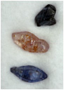 写真1は、セイロンの各種コランダム、普通に言うと色々な色のサファイア原石をネックレスのように並べたものだ。ケースの大きさは、約10cm×7.5cm。トップの2個はピンクスピネルの結晶で珍しい。その下が、両側パープル、ブルーグレイ、イエローサファイアの結晶で、下の中央はルビー、その両側はホワイト・サファイアだ。1個の結晶の大きさは、平均して1.5cmくらいの小さなものだ。