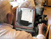 今では学生からのリクエストにより毎年のようにアトリエ訪問をするようになっています。目の前でのコート・ド・ジュネーブ(注2)の実演は目を見張るものですが(写真5)、今年はピンセット一本でブレゲヒゲをつくる様子も見せてもらいました(写真6)。