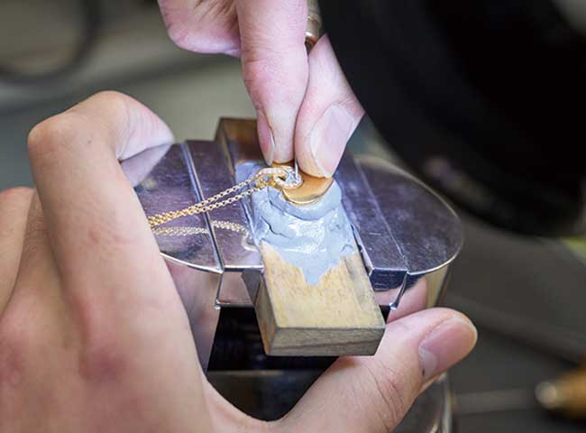 ジュエリー テクニシャン門倉 晃大さんジュエリーの修理は、制作の工程とは異なり、完成された状態のものに手を加えるのが難しいところだ。「お客様の大切なジュエリーをお預かりしているので、失敗は許されないという緊張感があります」。ただ壊れた部分を直すだけでは、また同じ箇所が壊れるリスクがある。だからジュエリーの状態から使用状況を推測し、必要な補強をするという繊細な心配りも求められる。修理の方向性が定まらず悩むこともしばしば。「解決の糸口がつかめた瞬間は、パズルのピースがはまったような快感があります。それがこの仕事の面白さかな」。