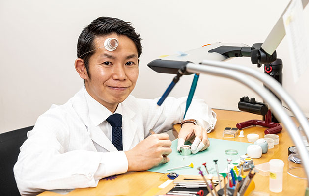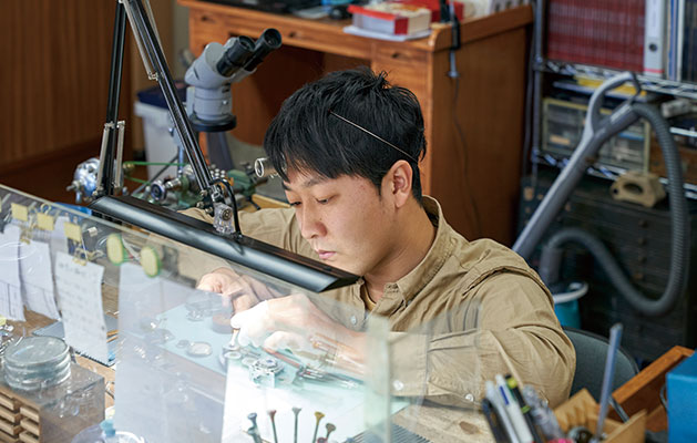 「共栄産業は修理専門会社。メーカーと違い、いろいろなブランドの時計の修理に携われるところが魅力ですね」と語る小泉さんは入社11年目の中堅ウォッチメーカーだ。