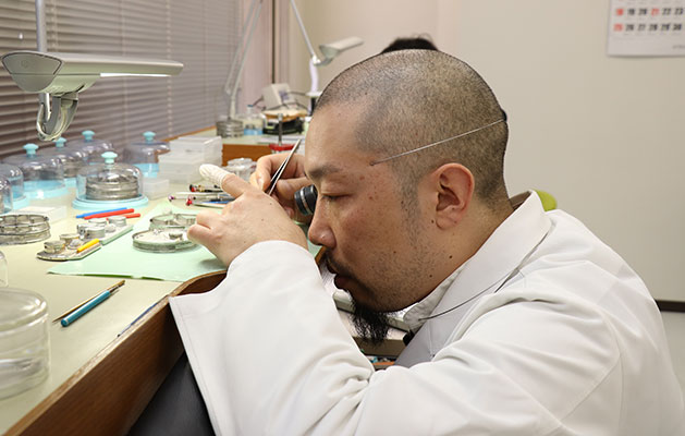 野村さんが時計の仕事に就こうと考えたのは大学生のとき。もともと手先が器用だったので、手の仕事がしたいと思ったのがきっかけ。「モノを売るというのではなく、自分の技術力で職人として働くという世界に魅力を感じました。形見の品など、取り扱う際はとてもプレッシャーだったりしますが、やり遂げてお客様に喜んでもらえるととても嬉しいですし、やりがいがありますね」