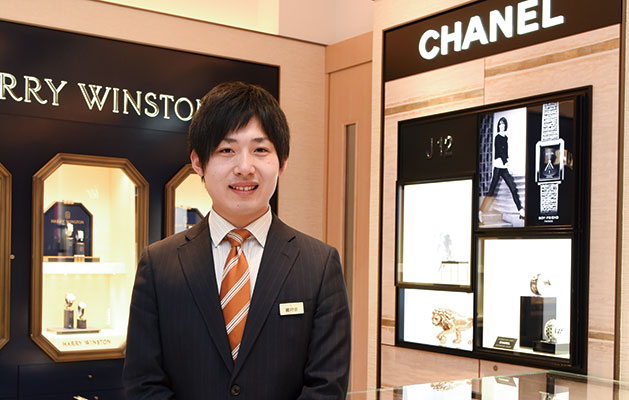 神戸で100年以上の歴史を持つ高級時計宝飾店のカミネに勤める國府田さん。入社して5年、販売スタッフとして店頭に立っている。ウォッチコースの卒業生のほとんどが修理職に進む中、國府田さんは「就職は販売の仕事しか考えていなかった」という。
