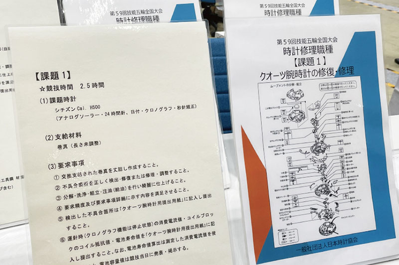 競技は2日間、合計8時間かけて行われます。1日目は、クオーツ式時計と機械式時計の不具合箇所を見つけだして、課題に定められた正しい状態になるように修理します。修理と同時に、分解から洗浄、注油、組立まで行い、きれいに仕上げて提出します。修理状況、そして仕上げの完成度も評価されます。2日目は支給される指定材料を使い、時計に使われる部品1種類を手作業で製作、その正確性や美しさを競います。